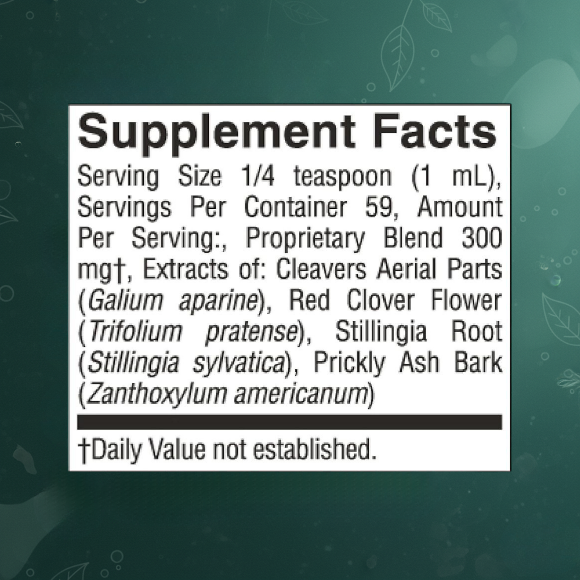 Each 1 mL serving of Zill contains 300 mg of our carefully crafted herbal blend, featuring Cleavers (Galium aparine), Red Clover Flower, and Prickly Ash Root. These time-tested botanicals are known for supporting the lymphatic system, promoting healthy circulation, and helping maintain inflammation balance.